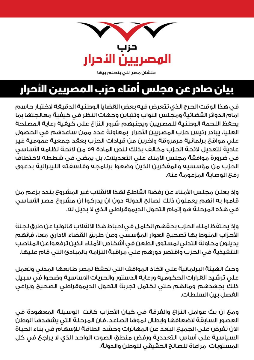 This is the most severe dispute to wrack the party that holds the highest number of seats in the current Parliament, since it emerged as a leading political entity after the 2011 revolution. Since 2013, with the ouster of the Muslim Brotherhood from power, the Free Egyptians, like other liberal parties, chose to align itself with the ruling authorities.